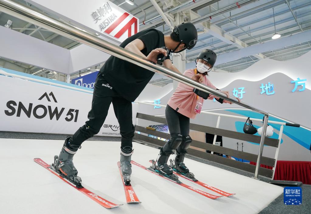 9月1日,參會的媒體記者(右)在服貿會體育服務展館內體驗一款滑雪模擬設備。新華社記者 張晨霖 攝