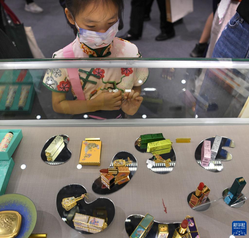 9月1日,小朋友在“博博會”故宮博物院展區觀看文創產品。