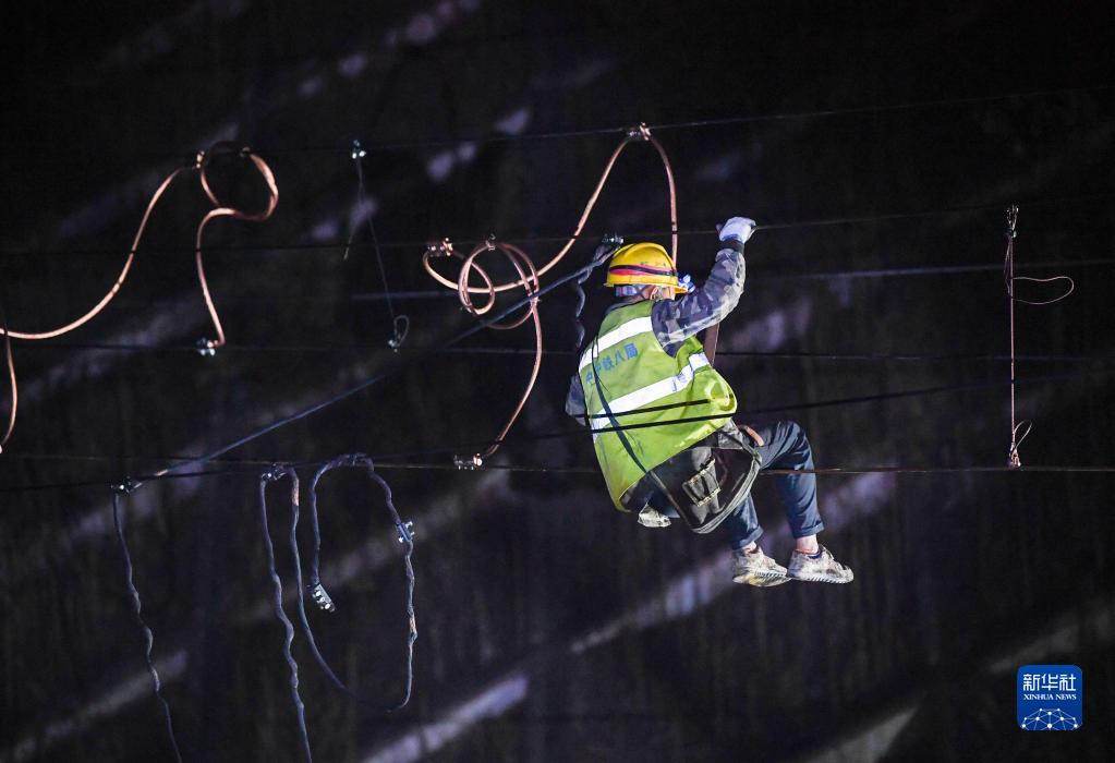 9月1日凌晨,施工人員在重慶鐵路樞紐東環線磨心坡站作業。新華社記者 王全超 攝