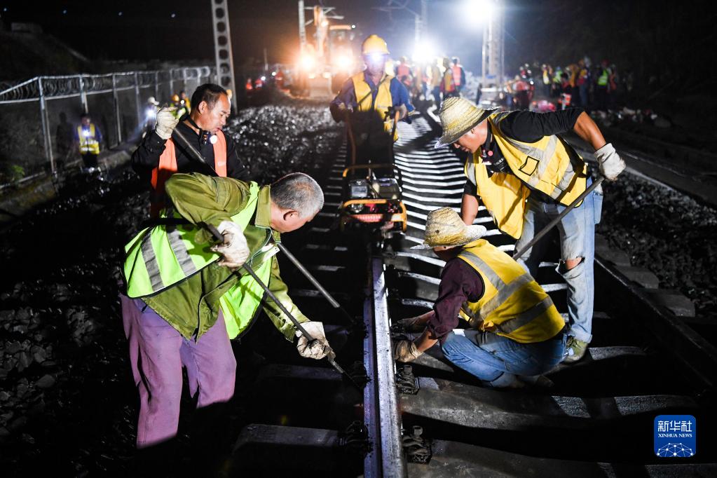 9月1日凌晨,施工人員在重慶鐵路樞紐東環線磨心坡站作業。新華社記者 王全超 攝