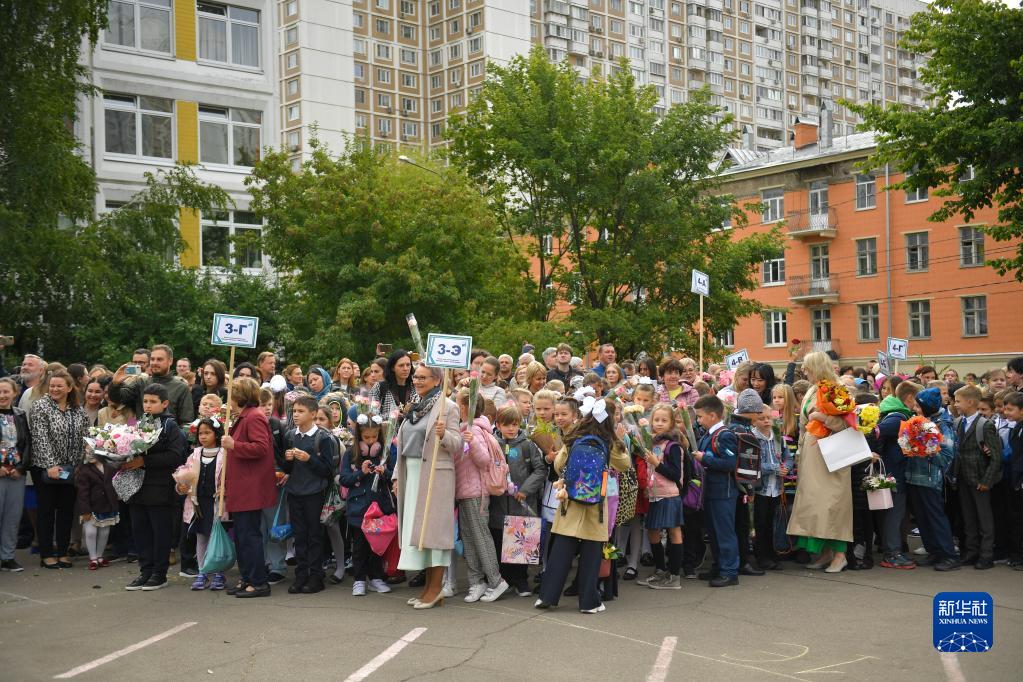 9月1日,在俄羅斯首都莫斯科,學生們捧著花束參加開學典禮。