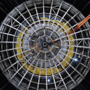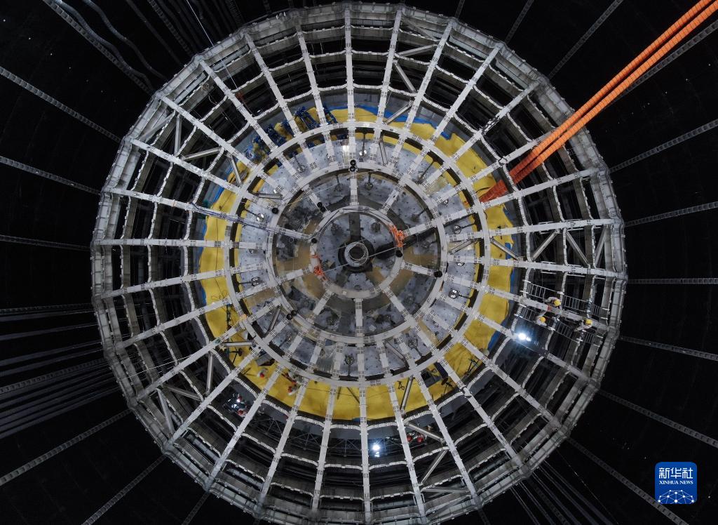 這是9月2日拍攝的位于地下700米的江門中微子實驗探測器,呈現出巨大的球形結構(無人機照片)。