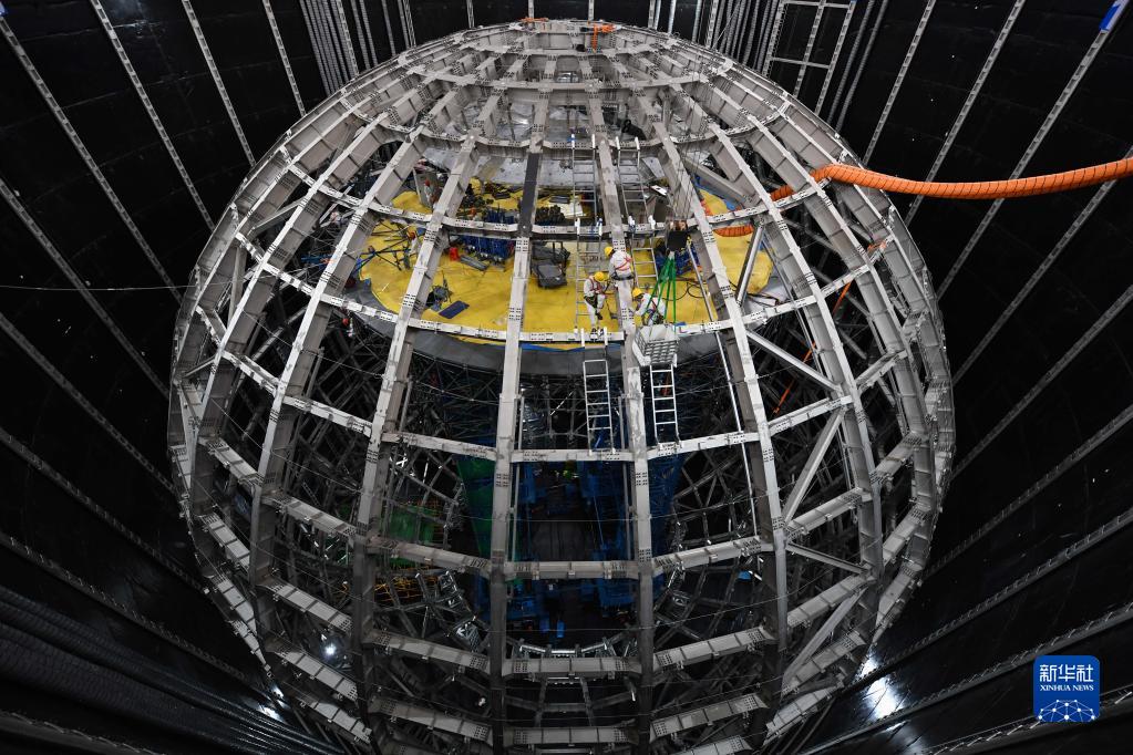 這是9月2日拍攝的位于地下700米的江門中微子實驗探測器,呈現出巨大的球形結構。新華社記者 鄧華 攝