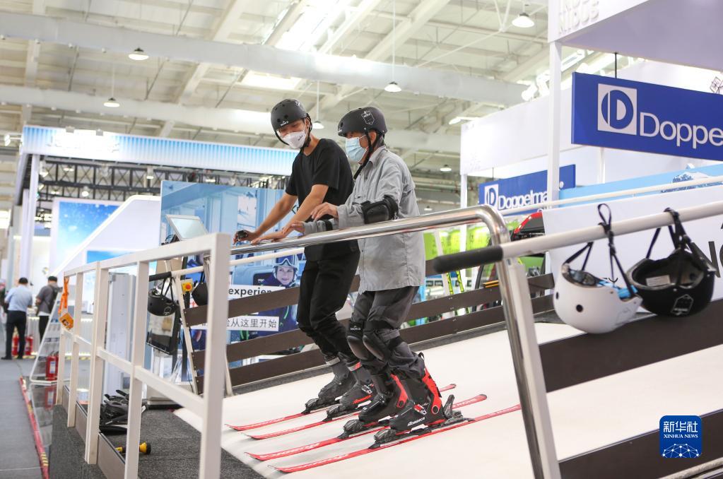 9月1日,一名老人(右)在服貿會體育服務專題展區體驗滑雪模擬設備。新華社記者 張帆 攝