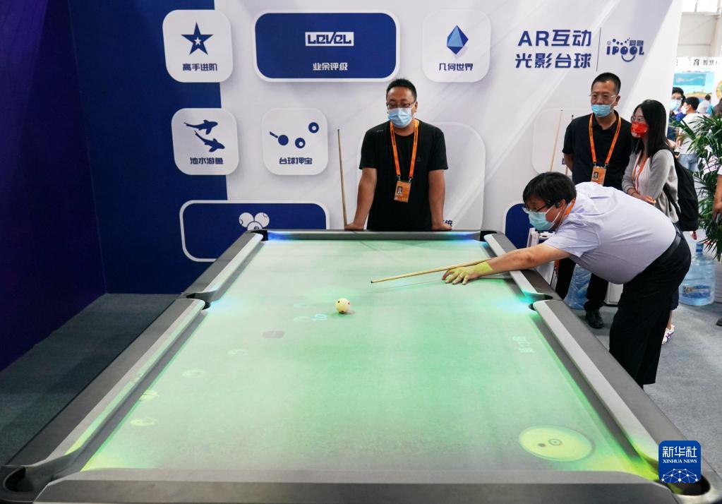 9月2日,人們?cè)诜Q(mào)會(huì)體育服務(wù)展館體驗(yàn)AR互動(dòng)光影臺(tái)球。新華社記者 張晨霖 攝