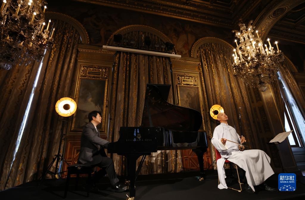 9月1日,郎朗(左)在法國巴黎市政廳舉行的新專輯《郎朗的迪士尼》發布會上與二胡演奏家果敢合作演奏。