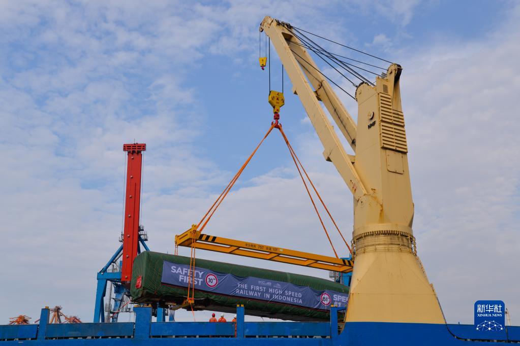 9月2日,在印度尼西亞雅加達(dá)丹戎不碌港舉行的運(yùn)抵儀式上,雅萬高鐵高速動車組在港口卸船。