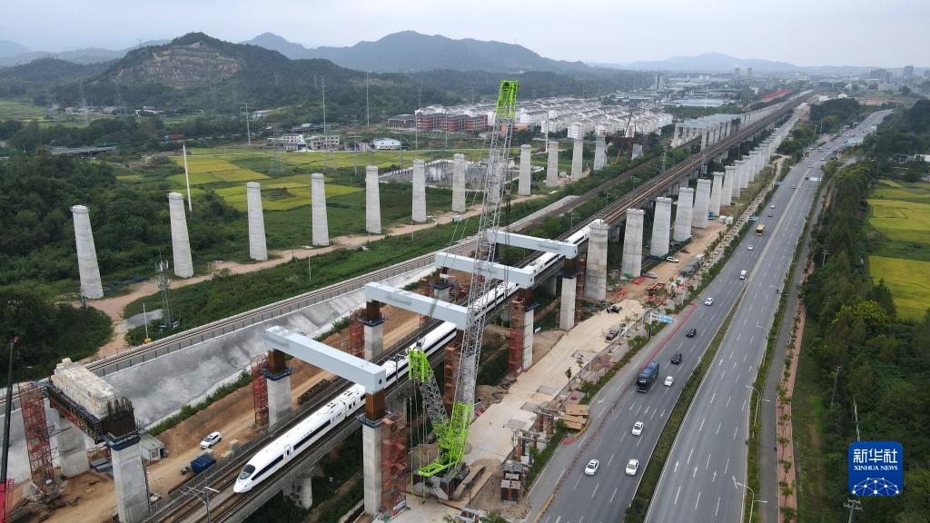 9月3日,一列高鐵列車經過完成吊裝后的門式墩鋼蓋梁(無人機照片)。