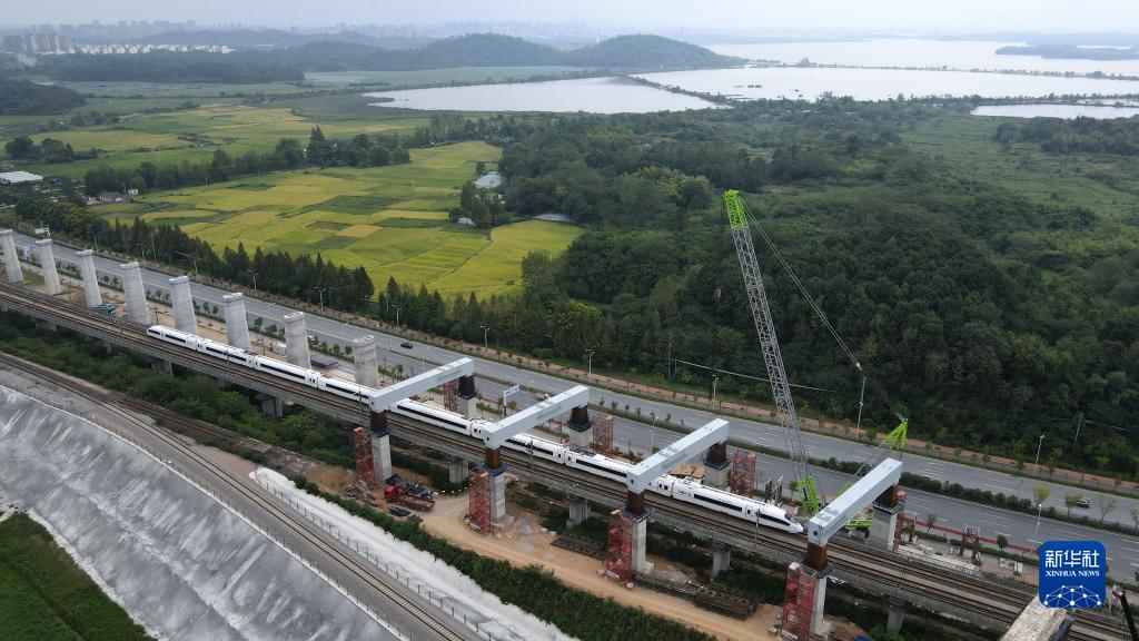9月3日,一列高鐵列車經(jīng)過完成吊裝后的門式墩鋼蓋梁(無人機(jī)照片)。