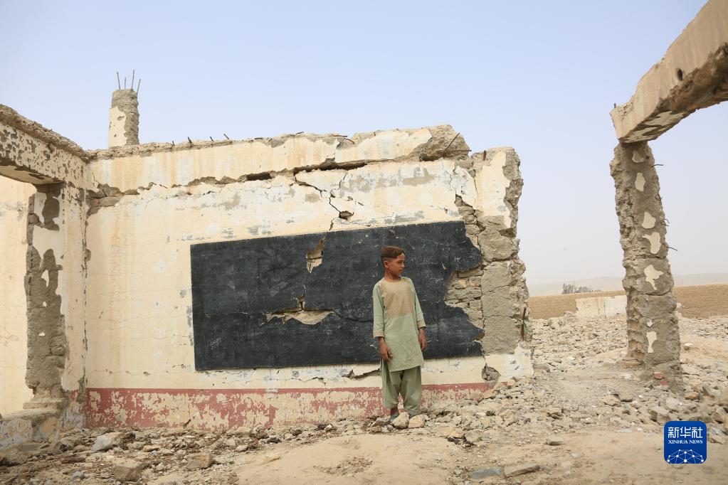 8月23日,在阿富汗南部赫爾曼德省桑金地區(qū),一名男孩站在廢墟之中。