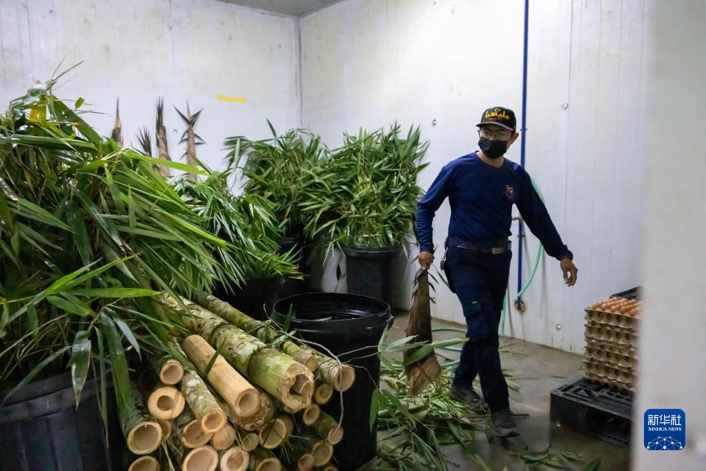 8月21日,在馬來西亞吉隆坡附近的馬來西亞國家動物園,飼養員阿克邁勒在冷藏室給大熊貓挑選竹子和竹筍。