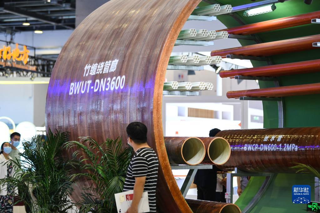 9月3日,在環境服務專題展區,觀眾參觀竹纏繞復合材料管廊。