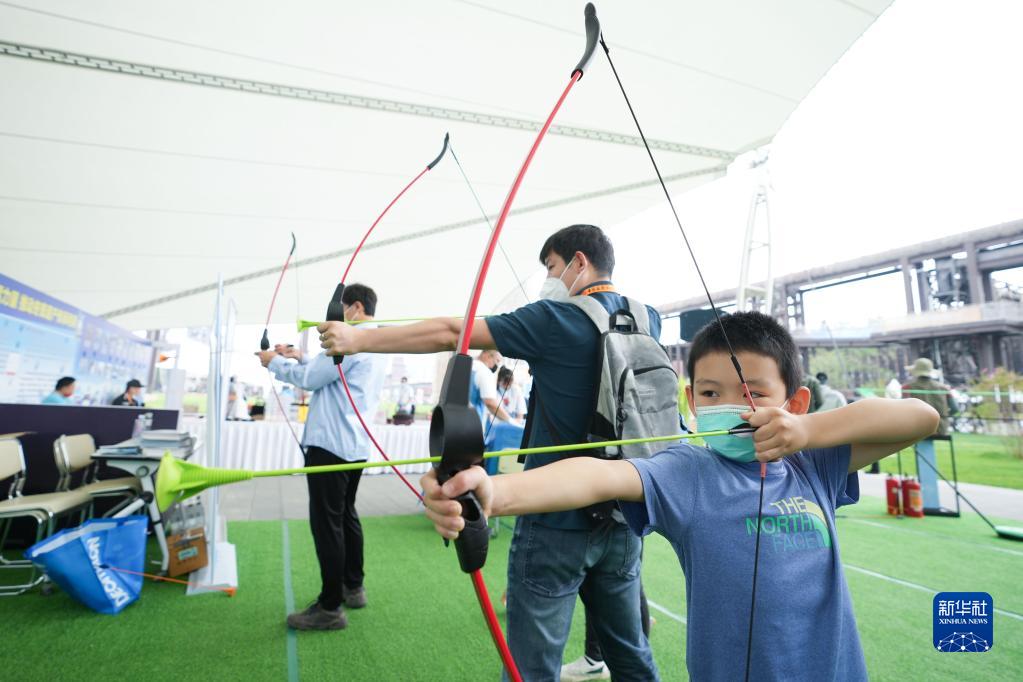 9月3日,一名小朋友在首鋼園區體驗射箭。