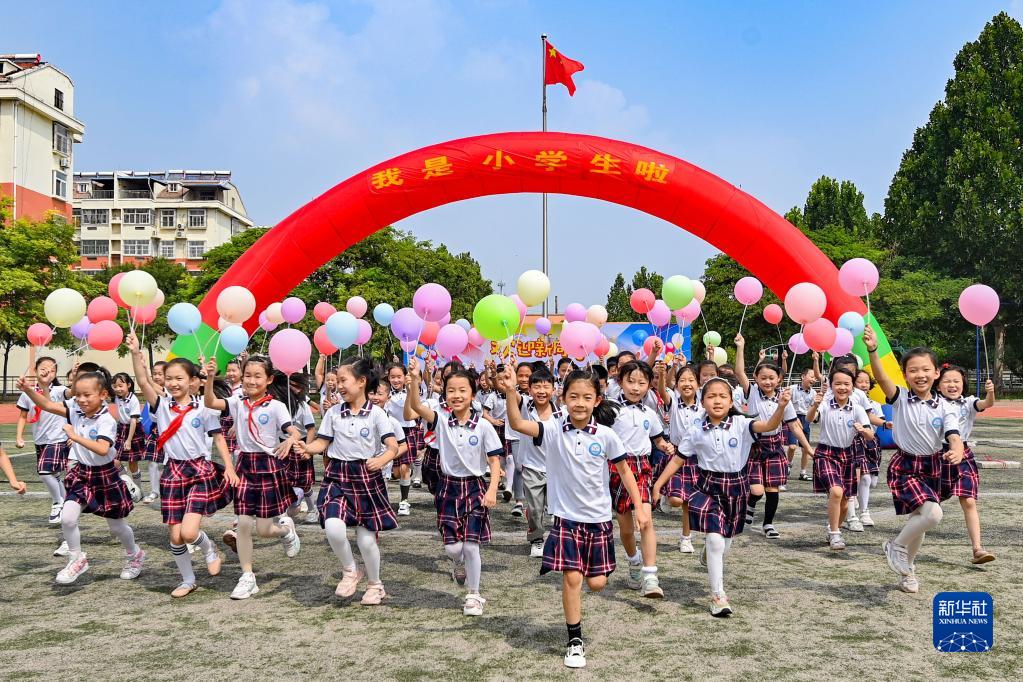 9月1日,山東青州經濟開發區小學學生手持氣球在操場上奔跑。當日,全國多地中小學開學。