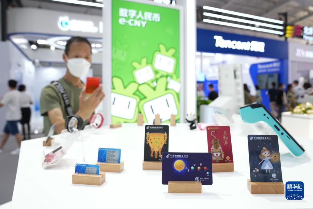 9月4日,在服貿會首鋼園區金融服務專題展上,參觀者參觀展出的數字人民幣硬件設備。 新華社記者 鞠煥宗 攝