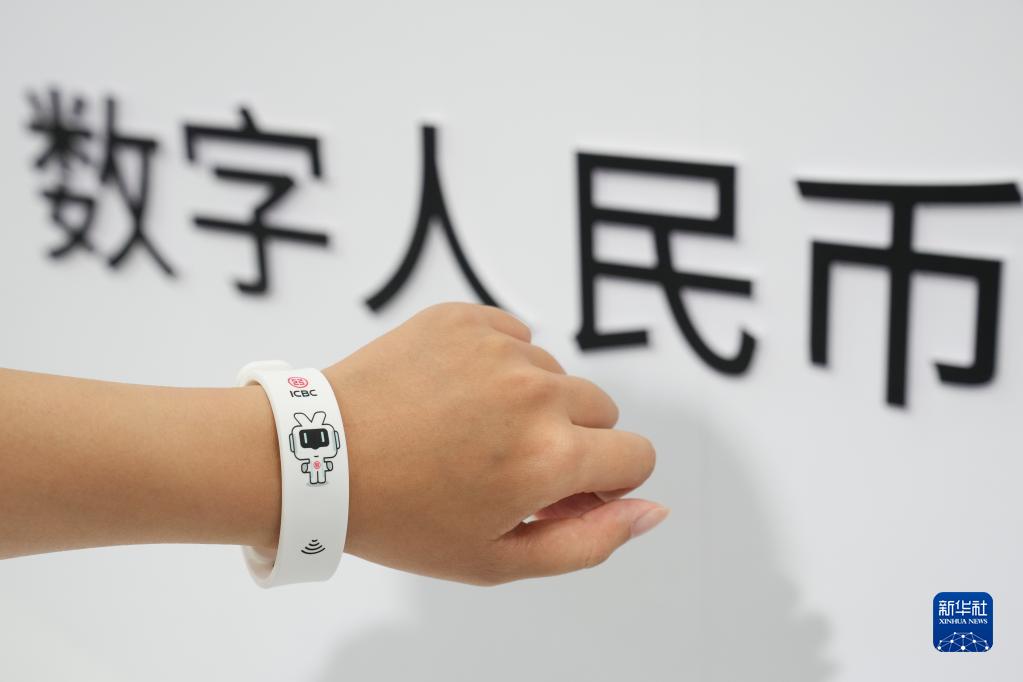 9月4日,在服貿會首鋼園區金融服務專題展上,一位中國工商銀行工作人員展示一款手環式數字人民幣硬件錢包。 新華社記者 鞠煥宗 攝