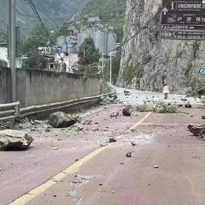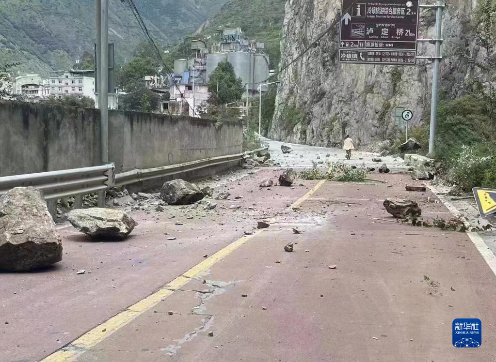山石掉落在四川省甘孜州瀘定縣冷磧鎮附近的道路上(9月5日攝)。