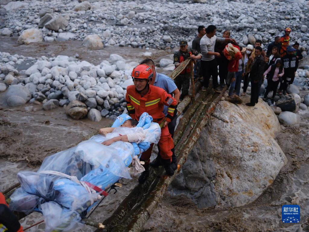 9月5日,四川森林消防總隊甘孜支隊消防員在瀘定縣磨西鎮青崗坪村轉移群眾和傷員。