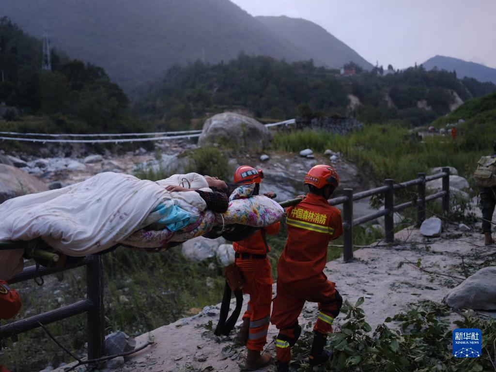 9月5日,四川森林消防總隊甘孜支隊消防員在瀘定縣磨西鎮(zhèn)青崗坪村轉移傷員。