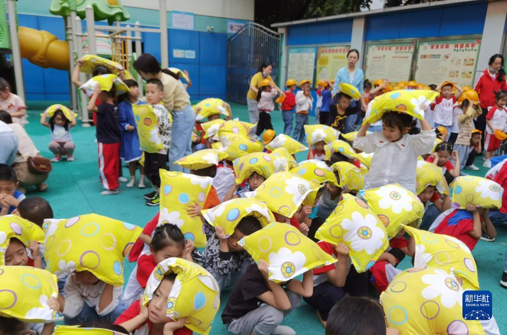 9月5日,雅安市石棉縣幼兒園老師組織幼兒有序疏散到操場,并對幼兒進行心理疏導。