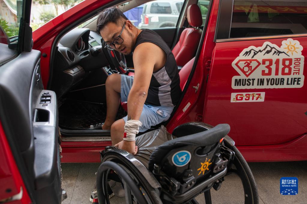 8月27日,到達成都“泉心健康之家生活重建訓練營”后,何鵬安裝完輪椅并下車。