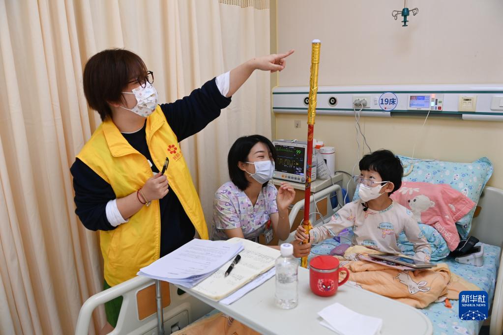 “病房學(xué)?!笔潜本┬玛柟獯壬苹饡_展的公益項目,通過在醫(yī)院內(nèi)或附近設(shè)立教室,組織教師和志愿者給長期住院的大病兒童上課,教他們做手工、繪畫?!安》繉W(xué)?!表椖坑?012年啟動,截至目前在全國18個?。▍^(qū)、市)有38間病房學(xué)校教室,累計服務(wù)患兒超過11萬人次。新華社記者 蔡湘鑫 攝