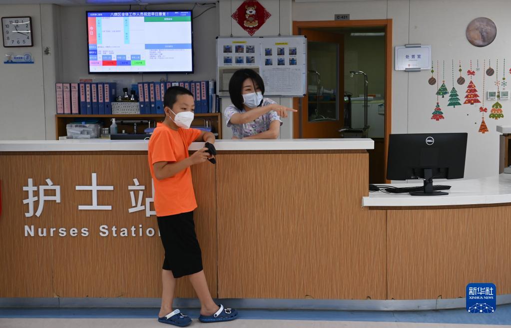 8月30日,在北京高博博仁醫院,小曲(化名)在玩遙控玩具車,護士長吳小圓與其交談。