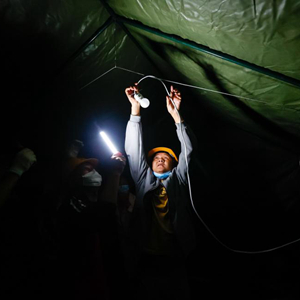 9月5日晚,在四川甘孜州瀘定縣磨西鎮(zhèn)的受災群眾臨時安置點,工作人員安裝電燈。