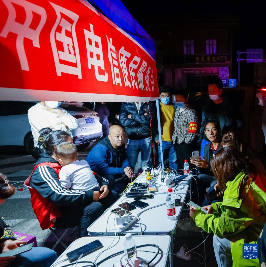 9月5日晚,在四川甘孜州瀘定縣磨西鎮的受災群眾臨時安置點,人們在中國電信便民服務點為手機充電。
