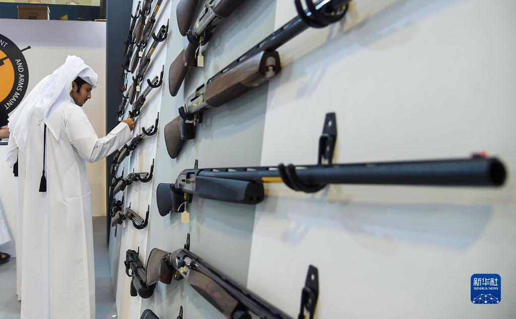 9月5日,一名男子在卡塔爾多哈的國際狩獵和獵鷹展上查看獵槍。