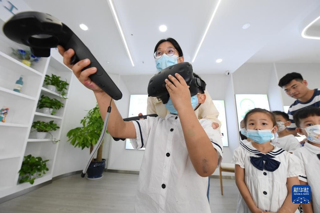 9月6日,在位于湖州吳興區(qū)愛(ài)山街道的垃圾分類宣教館,老師帶著孩子做VR趣味游戲。