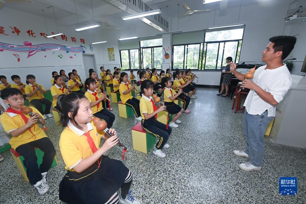 9月6日,葫蘆絲藝人聶棟楊在給板橋鎮板橋小學的學生上葫蘆絲課。