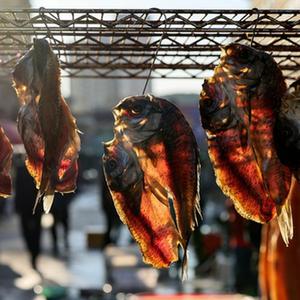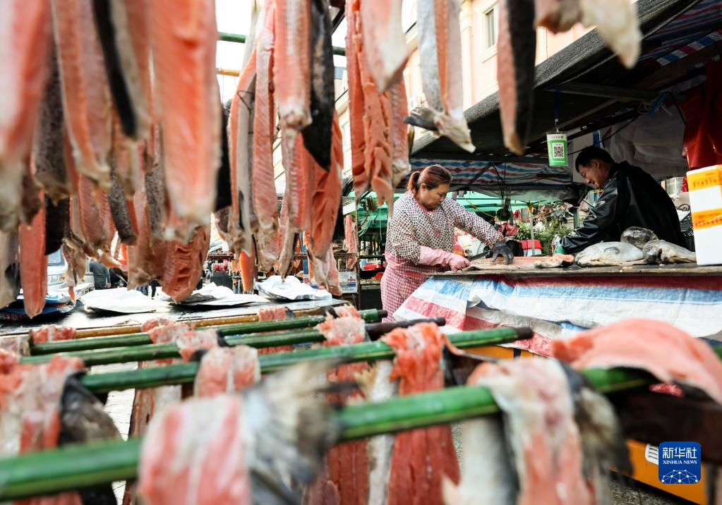 9月4日,在撫遠市東極魚市,魚商制作準備晾曬的魚干。