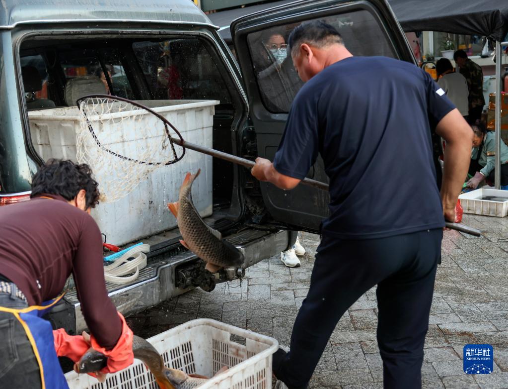 9月4日,在撫遠(yuǎn)市東極魚(yú)市,一名魚(yú)商將剛捕撈的活魚(yú)裝進(jìn)魚(yú)箱。