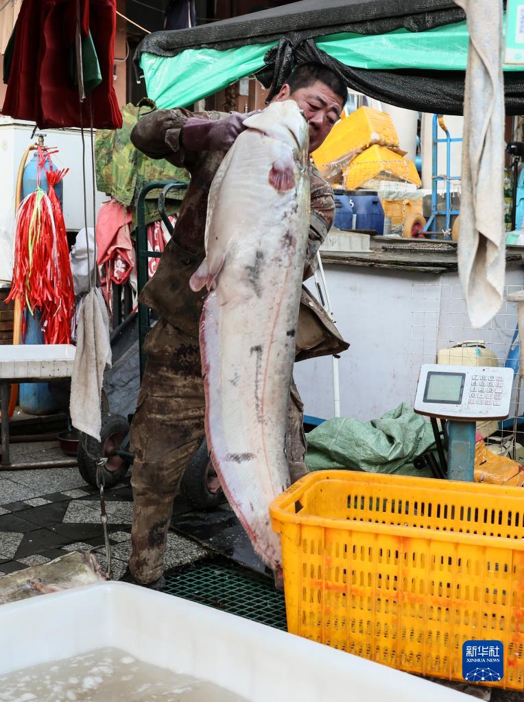 9月4日,在撫遠市東極魚市,一名魚商準備給魚稱重。