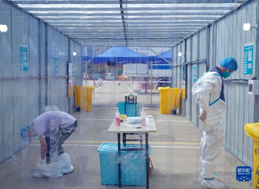 9月5日,核酸檢測隊工作人員在氣膜方艙實驗室的脫衣區換下防護服。