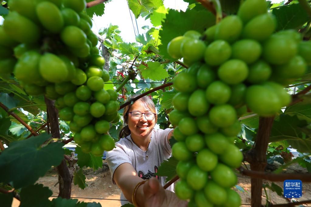 9月6日,在丁家房鎮大蛇山子村,果農在大棚里查看葡萄成熟情況。