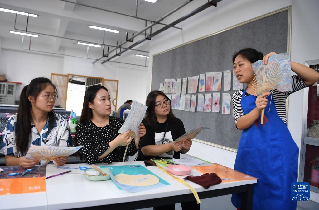 9月8日,在紙箋加工技藝傳習基地,愛好者體驗用流沙箋制作扇面。