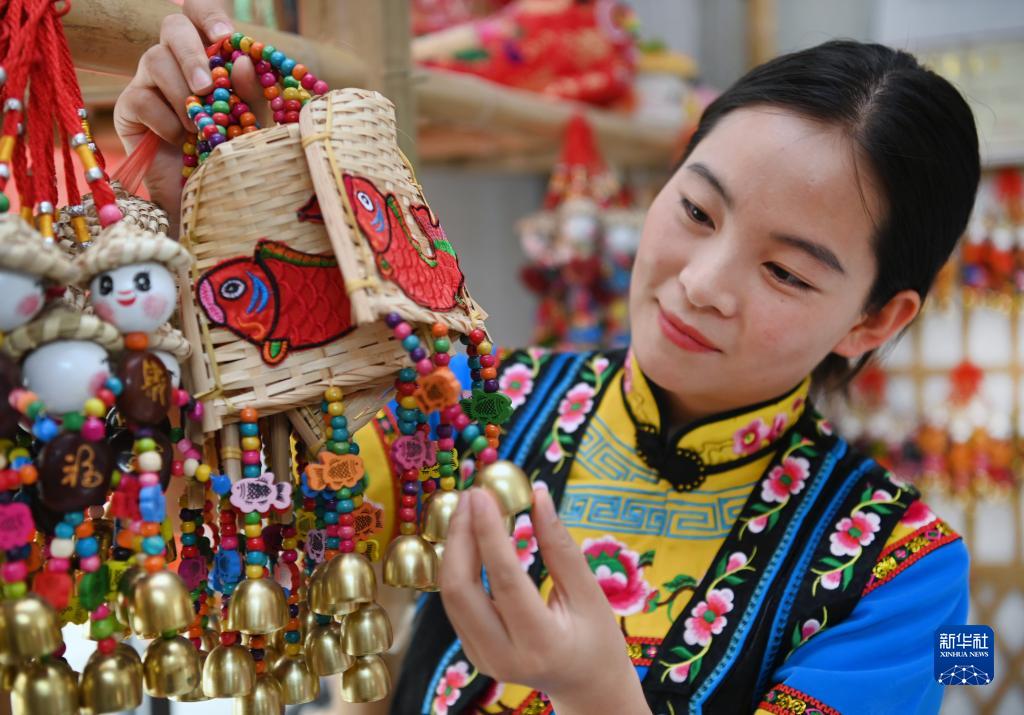 9月7日,年輕人在羌族文化博覽園展銷廳觀看羌編工藝品。寧強縣以“公司+合作社+基地+農戶”的發展模式吸納當地群眾從事羌編,實現居家靈活就業。