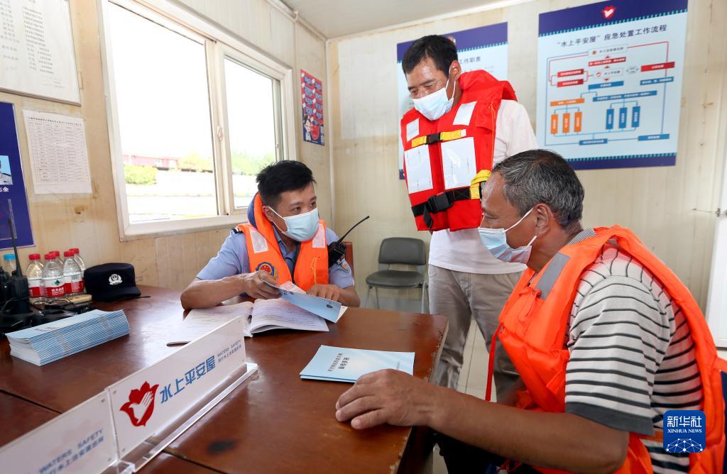 9月8日,上海市公安局閔行分局水上治安派出所民警張怡賓(左一)在“水上平安屋”為船民講解船舶航行安全及反詐騙常識。