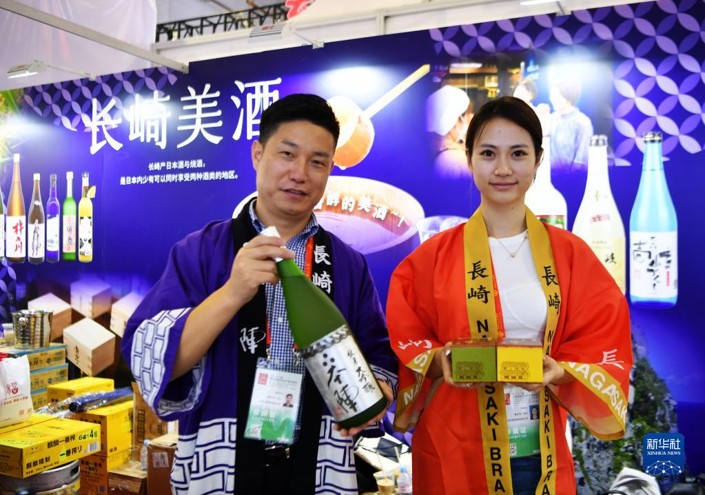 9月8日,在第二十二屆投洽會日本長崎展位,工作人員在展示清酒和蛋糕。