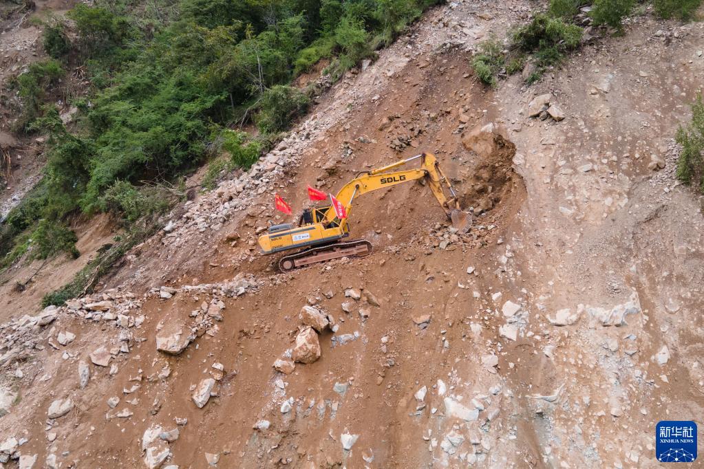 9月8日,四川路橋的工作人員搶修石棉縣與瀘定縣得妥鎮之間的道路(無人機照片)。