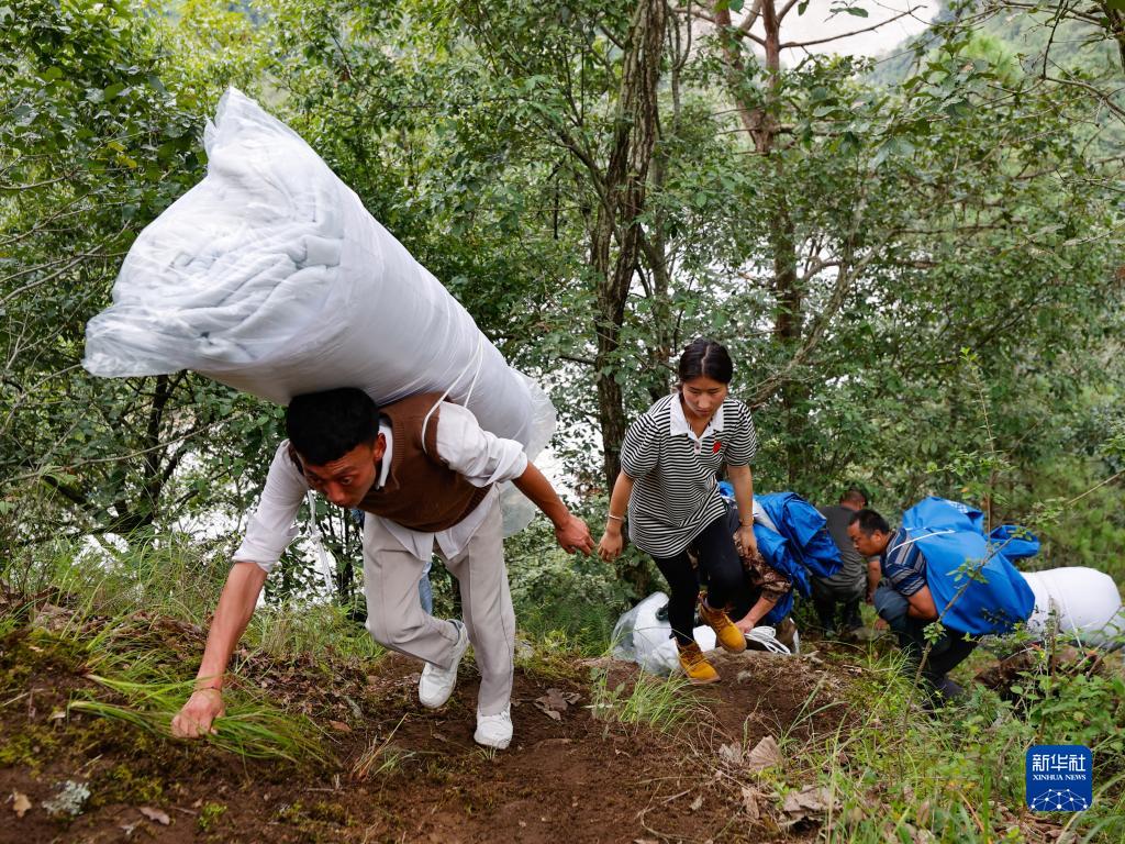 四川瀘定地震發生后,震中磨西鎮附近一些居住在山上的村民,因道路損毀未能全部撤出,只能在相對安全的開闊地帶搭建臨時安置帳篷。救援人員和志愿者沿著臨時架設的過河小橋和開辟出的上山小路,通過肩背人扛,把飲用水、帳篷等物資送上山,為山上臨時安置居民建立了一條供給線。