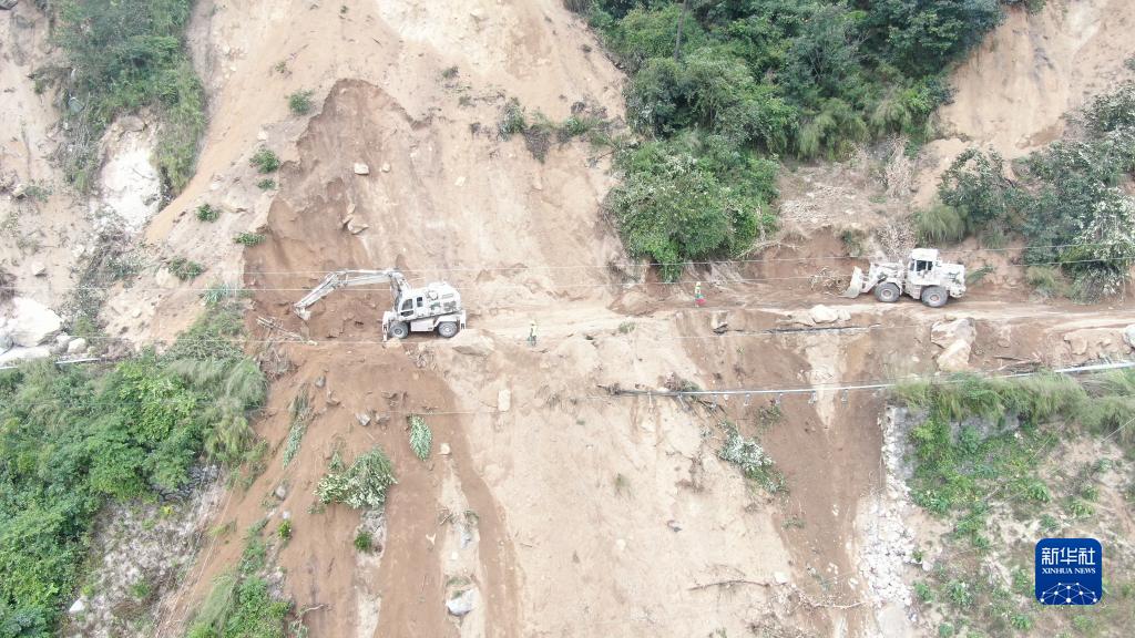 9月8日,西部戰區陸軍第77集團軍某工兵旅官兵在雅安市石棉縣進行道路搶通作業。(無人機照片)。新華社發(李雪嬌 攝)