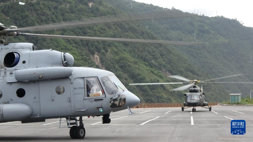 9月6日,西部戰區空軍運輸搜救某團兩架直升機抵達瀘定縣震中區域。新華社發(劉星宇 攝)