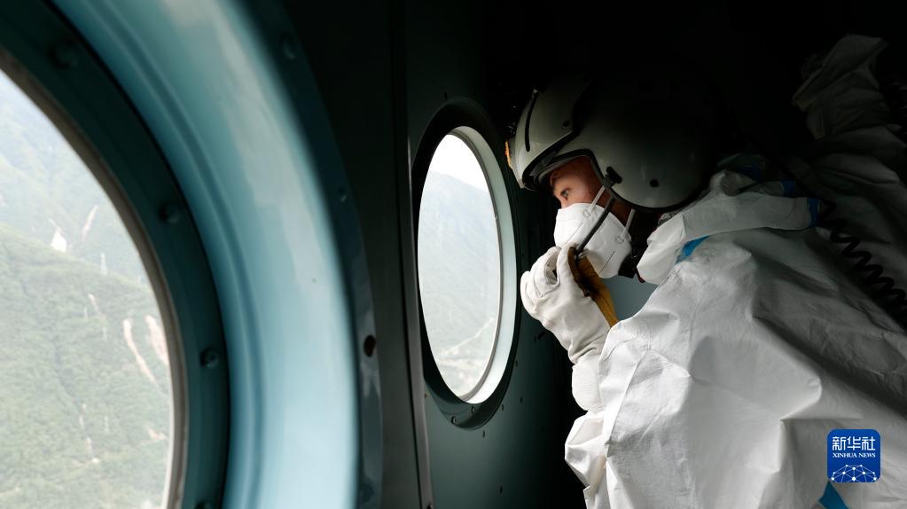 9月6日,西部戰(zhàn)區(qū)空軍運(yùn)輸搜救某團(tuán)空中救生員在直升機(jī)上搜索被困群眾。新華社發(fā)(胡建軍 攝)