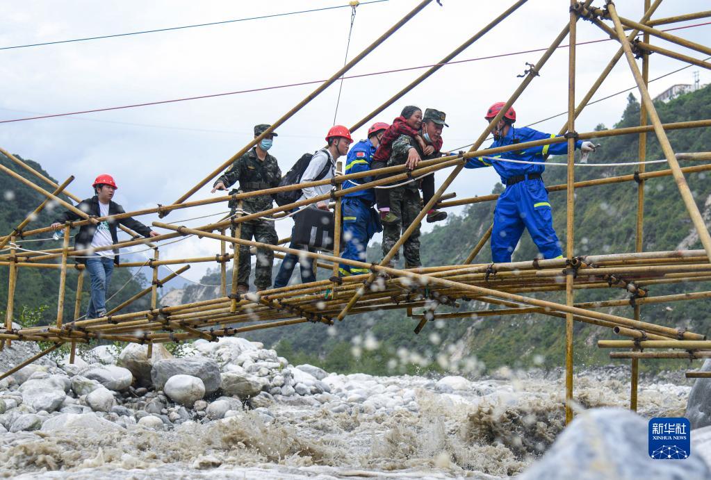 9月7日,武警四川總隊甘孜支隊官兵和地方救援隊在瀘定縣磨西鎮(zhèn)共和村利用剛建起的鋼架橋轉(zhuǎn)移受傷群眾。新華社發(fā)(段力新 攝)