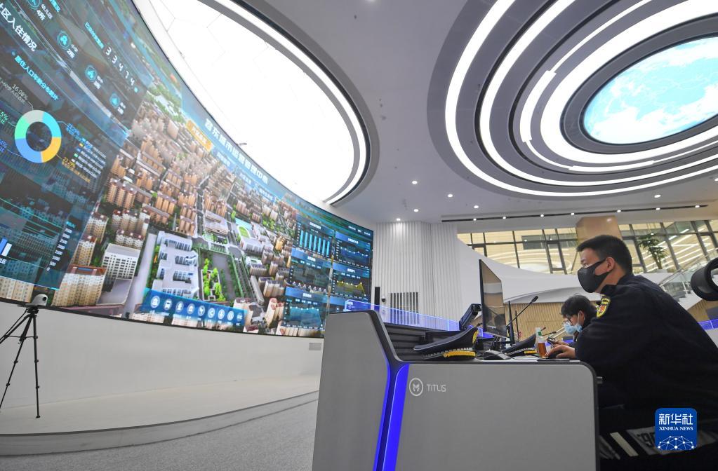 工作人員在雄安新區(qū)容東城市運(yùn)營管理中心監(jiān)管平臺工作(2022年3月29日攝)。