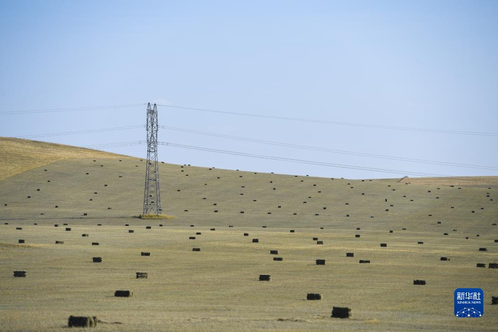 錫林郭勒盟阿巴嘎旗的一處草原上點綴著打成捆的牧草(9月8日攝)。