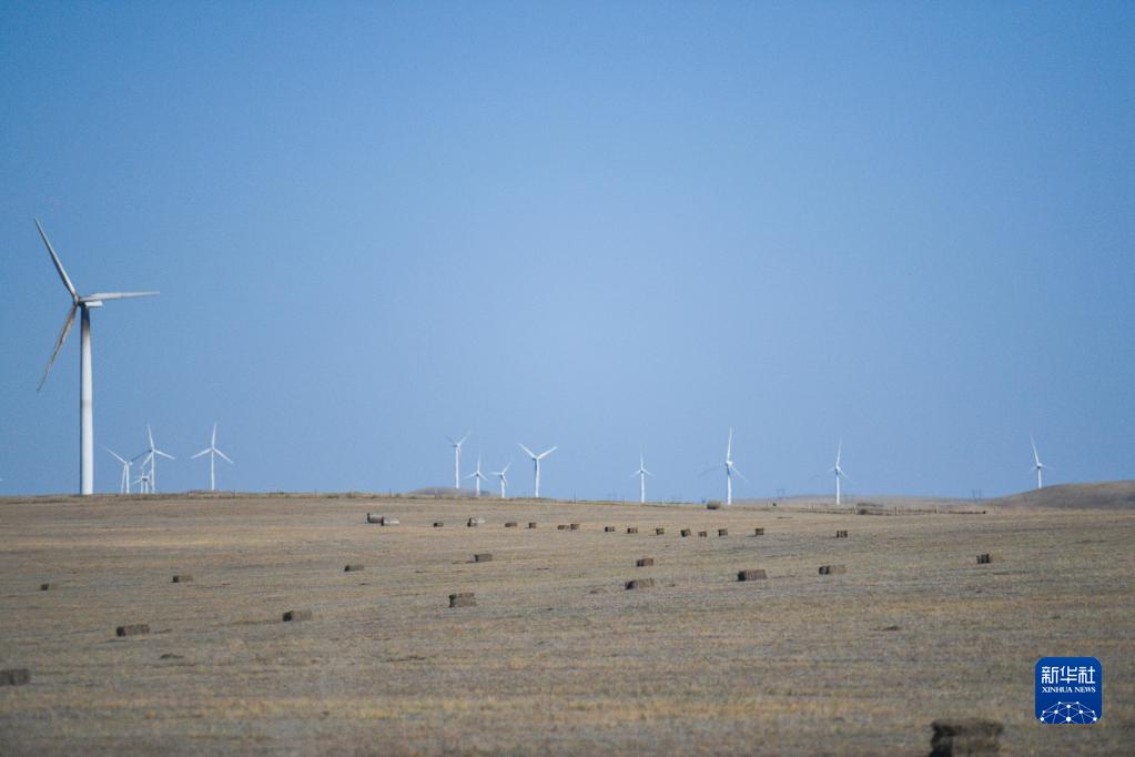 錫林郭勒盟阿巴嘎旗的一處草原上點綴著打成捆的牧草(9月8日攝)。